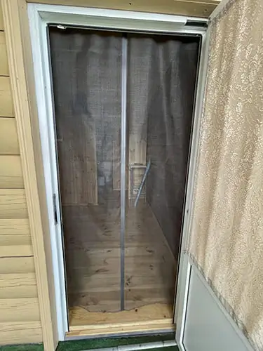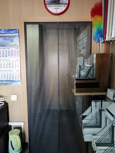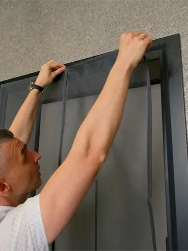 Дверная шторка от комаров на сплошных магнитах легко крепится в проём двери с двухстороннего скотча и текстильной застёжки (в комплекте).