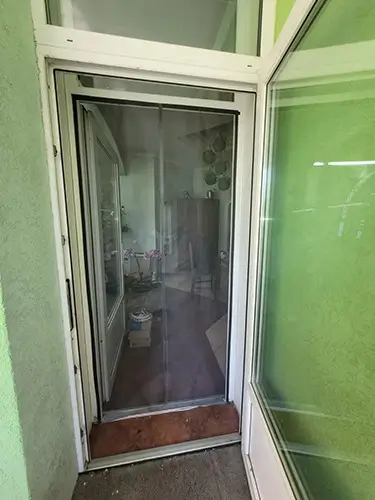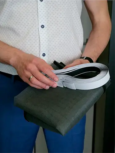 Приложите сетку к проёму. Сделайте разметку карандашом. Сетка не должна стелиться по полу, быть сильно натянута по ширине, это мешает смыканию створок.