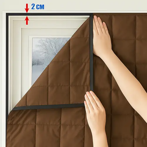 С обеих сторон штора сделана из ветронепродуваемого и водоотталкивающего материала одинакового цвета. Внутри, по всей площади, зашит утеплитель синтепон, штора от холода сделана по типу зимней куртки. Синтепон пристрочен к материалу, чтобы впоследствии не сдвигался. По периметру шторки установлена ​​липкая лента, она многоразовая, используется в обуви, сумках и одежде. Также в комплекте идет обратная часть липучки со скотчем. Ничего подрезать и ушивать не нужно, комплект полностью готов к установке и использованию. Термоизоляционную штору можно снимать и одевать нескончаемое количество раз.